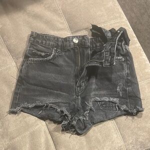 These Zara black jean shorts feature a high-waisted design with a raw, distressed hem for a trendy, casual look. Made from durable denim, they offer a comfortable fit perfect for everyday wear.