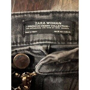 These Zara black jeans are a must-have for any fashionista. Featuring a unique exposed zip patch and a 5-pocket design, these jeans are both stylish and functional. The high-rise waist and regular fit make them a perfect choice for any occasion.