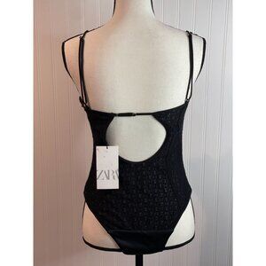This Zara body suit features a chic lace design with adjustable straps and a convenient snap closure. Designed for style and comfort.