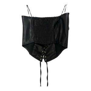 Stylish black crop top. Lace-up front detail. Spaghetti straps. Perfect for a chic look.