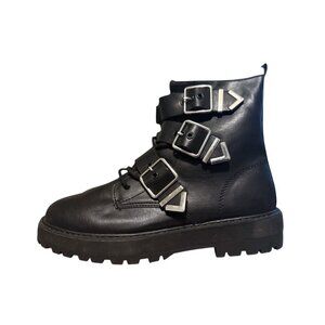 Zara Black Leather Combat Boots With Triple Buckles & Side Zipper EU 37 NWOB