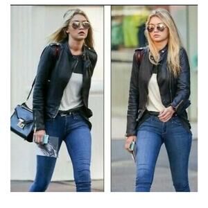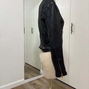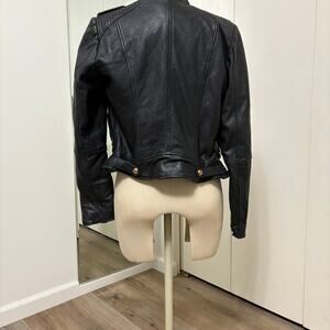 Stylish black leather jacket. Perfect for casual outings. Features a sleek design.
