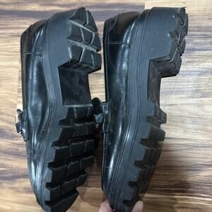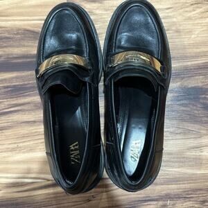 These Zara loafers feature a sleek black leather finish with a classic moccasin-style toe and a decorative strap. The modern platform sole adds a contemporary twist to the timeless design, making them a versatile choice for various occasions.