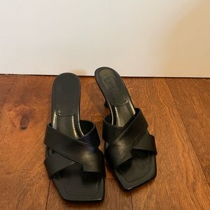 Elegant black leather sandals. Features a sleek design with a comfortable heel. Perfect for any occasion.
