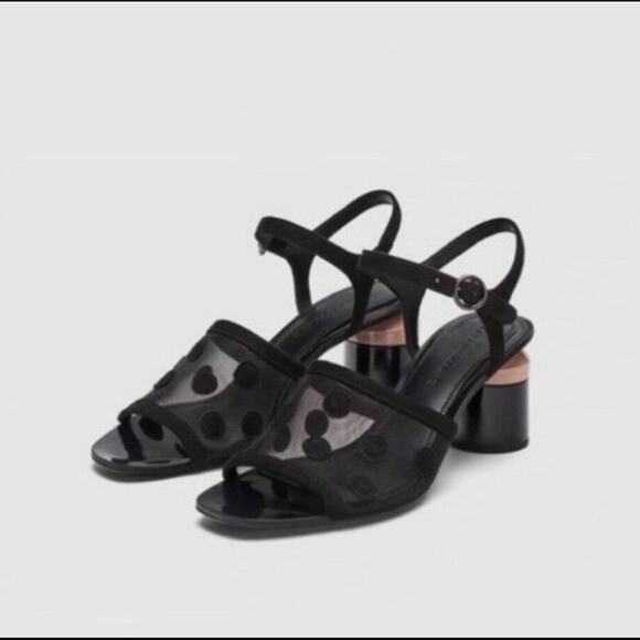 Zara Black Mesh Polka Dot Cylinder Block Colour Heels WOMENS 41