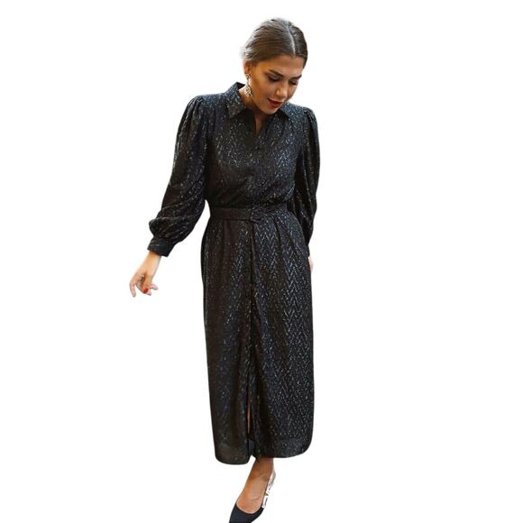 Zara Black Metallic Long Sleeve Shirt Midi Dress Size XS