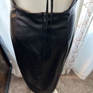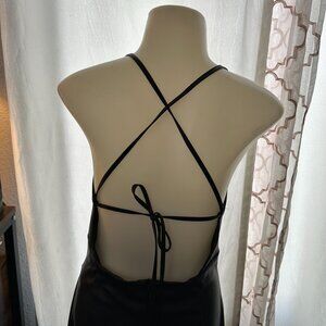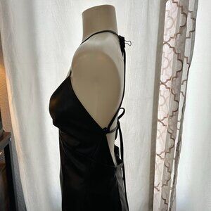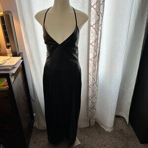 Elegant black midi dress. Features a sleek design with a side slit. Perfect for evening wear.