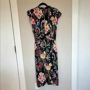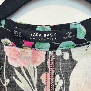 This Zara midi dress offers a sophisticated silhouette, perfect for any occasion. Crafted with attention to detail, it features a timeless design that complements any wardrobe. The dress's elegant cut ensures a flattering fit, making it a versatile choice for both day and evening wear. Pit to pit is 19 inches. Total length of dress is 46 inches..