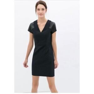 Navy blue V-neck short dress with faux leather detailing on the sleeves. With zip closure on the side. Short sleeves. From Zara's BASIC Collection, in size M. Made in Morocco.