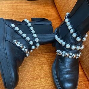 Step out in style with these chic black boots, adorned with elegant pearl embellishments. Perfect for adding a touch of sophistication to any outfit.