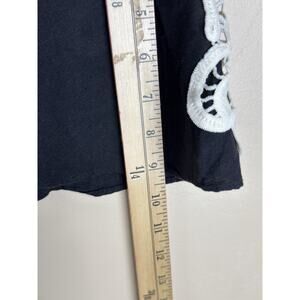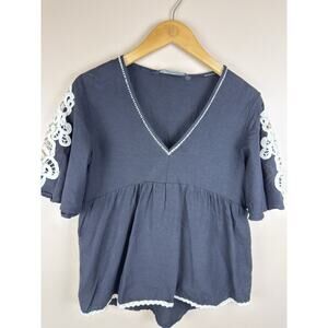 This black peplum blouse from Zara features white embroidered lace details on short, flared sleeves and hem. It has a flattering empire waist with a V-neck, creating a light and airy silhouette. Size Small.