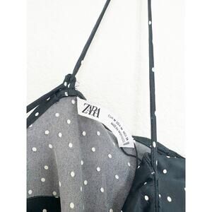 A flowy midi slip dress from Zara featuring a classic black and white polka dot pattern, designed with delicate spaghetti straps, a flattering ruched bust, and a stylish side slit for movement. Lightweight silky feel with a lace up detail on the back. Satin effect dress with ruched V-neckline and tied thin crisscross straps at back.