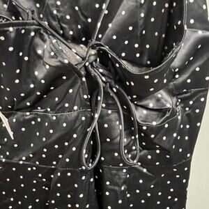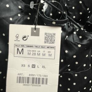New with tags womens size Medium satin like slip dress from Zara-- black with small white polka dot pattern, has strappy tie up back detailing, midi length with a slit