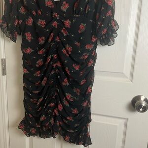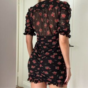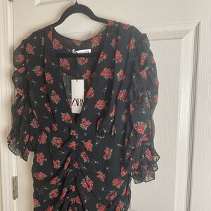 Zara Black Printed Mesh Ruched and Draped Dress with Red Rose detailing size XX-Large NWT