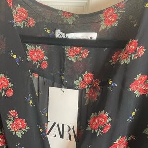 Zara Black Printed Mesh Ruched and Draped Red Rose detailing size xxl