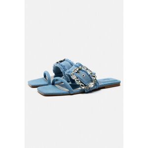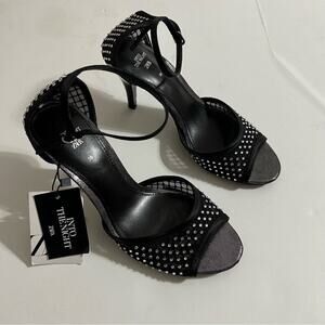 High heel sandals with rhinestone detail. Buckled strap closure at ankle.