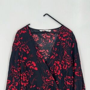 Zara Black Red Floral Rose Wrap Front High Slit Midi Dress
