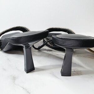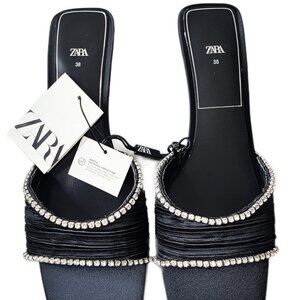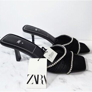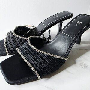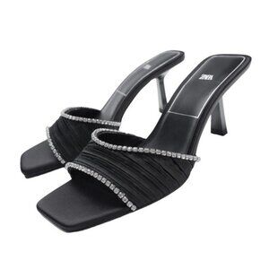 Zara Black Rhinestone High Heel Sandals Size 7.5 US 38 Square Toe Slip On New