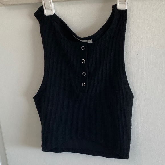 Cute black top for the summer. Doesnt fit me anymore ): Sleeveless ribbed crop with henley-style snap buttons. Stretch knit fabric for a snug fit. Easy to layer or wear alone for casual looks.