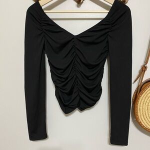 Elegant black top with ruched detailing. Long sleeves and a flattering fit.