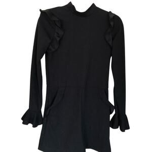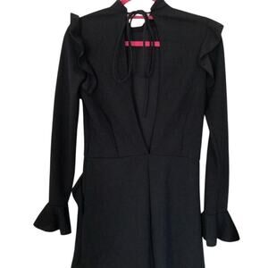 Zara Black Mock Neck Ruffle Romper. Size XL, open back long sleeve romper from ZARA. short frilled jumpsuit. Ruffle sleeve, ruffled shoulders, and ruffles at the pockets. Open back that ties with a small string behind the neck. Mock neck. Shorts. Really cute and comfortable. Excellent condition!