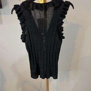 Sleeveless knit camisole with cascading ruffle trim. Deep V-neck with delicate front ties. Soft ribbed texture for subtle stretch. Dress up or layer under jackets.