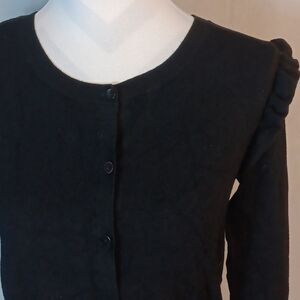 Stylish black cropped cardigan with ruffle sleeves. Size Small with a pit to pit measuring 17" and a length of 20". Perfect for layering.
