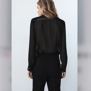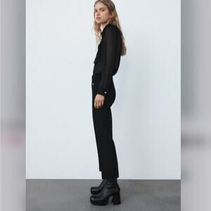 Sheer fabric, front button, shoulder pants, collar, long sleeve, tweed fabric on shoulders and front pockets are tweed fabric.