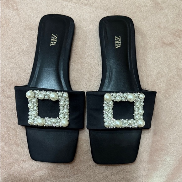Chic black sandals by Zara. Features striking pearl accents. Ideal for stylish outings.