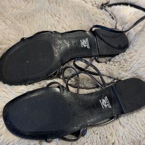 Chic black sandals featuring bold silver accents. Ideal for a stylish touch.