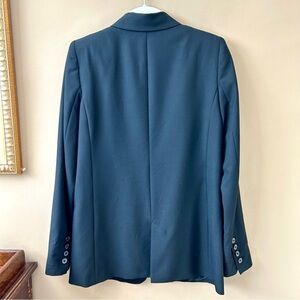 This classic tuxedo jacket from Zara Woman features a point collar with satin lapel, one button closure, four functional buttons at each cuff, 2 flap pockets at front, slightly structured padded shoulders, and single rear vent. It is fully lined. 79% acetate, 21% acetate / 100% polyester / 29% viscose, 4% elastane, 67% polyester
