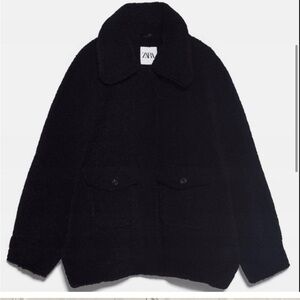 Good used condition. Stylish black fleece jacket from Zara. Features button closure and large collar. Perfect for a cozy, chic look.