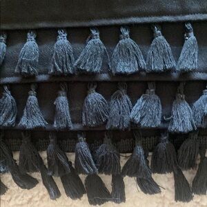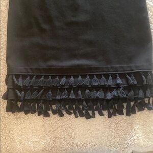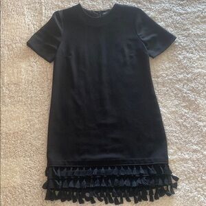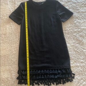 This elegant black sheath dress from Zara is perfect for a cocktail night out. Featuring a classic crew neckline and short sleeves, it offers a sleek silhouette that falls to a midi length. The playful tassel fringe at the hem adds a touch of movement and flair to this minimalist design.