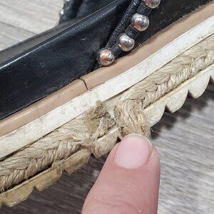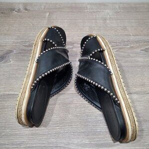 Zara Black Silver Studded Cross Strap Slides Womens 9 Open Toe Slip On Sandals. Please see pictures for condition. General wear. A small section of the rope has come loose on the right shoe along with a few studs.