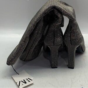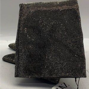 Chic black heeled boots with sparkling detail. Perfect for a glamorous look.