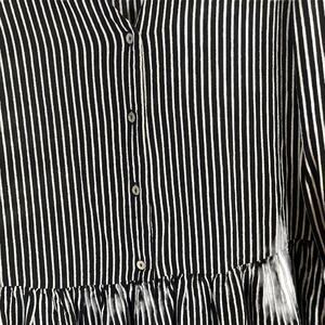 The Zara Black Striped Peplum Button Front Shirt is a women's garment that features a stylish and flattering peplum design. The shirt is black with thin white stripes, giving it a classic and timeless look. The button front adds a touch of sophistication, while the peplum design accentuates the waistline for a flattering silhouette. This shirt is perfect for both casual and formal occasions, making it a versatile addition to any wardrobe.