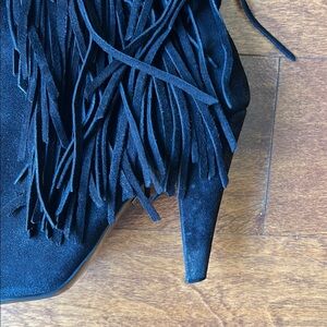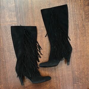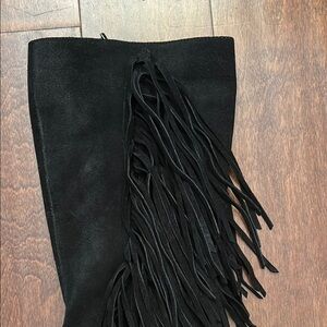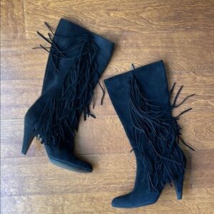 Zara Black Suede Heeled Boots with Long Fringe, Size 10