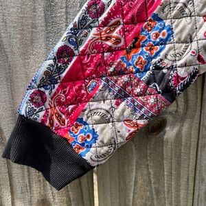 Cropped black sweatshirt with glorious bright, paisley, quilted sleeves. Crewneck.