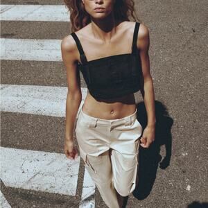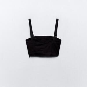 Straight neck crop top with straps. Side hidden in-seam zip closure.