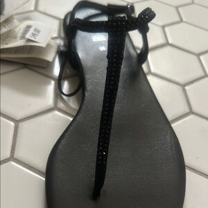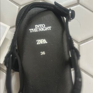 These sleek Zara sandals feature a minimalist T-strap design in solid black, complemented by a secure ankle closure. Perfect for both casual and dressier occasions, they offer a versatile and contemporary aesthetic.