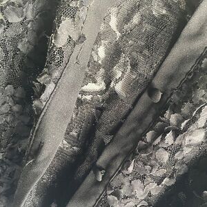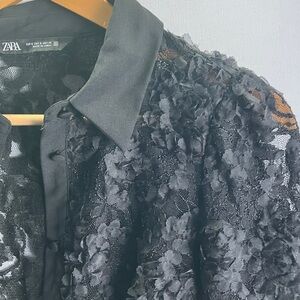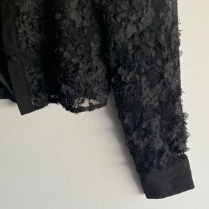 Chic black lace blazer with textured floral design. Perfect for adding elegance to any outfit. Shoulders, PTP and length all 17”.