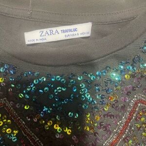 Elegant black blouse with vibrant embellishments. Features intricate beadwork. Ideal for stylish outings. Measures 19x22 and weighs 5.4 oz
