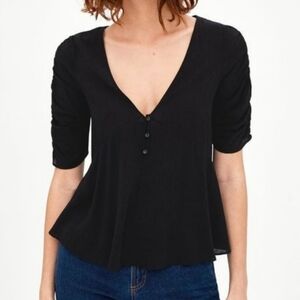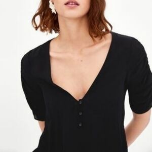 Zara Black V Neck Button Front Ruched Sleeved Top
