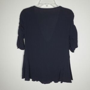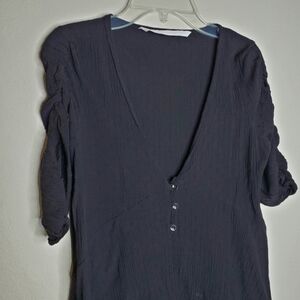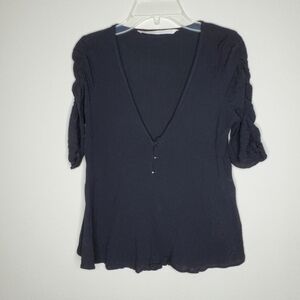 Excellent condition. Black. V neckline. Button front. Ruched/Cinched at sleeves. Has a lot of stretch. Comes with an extra button.