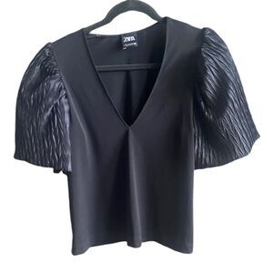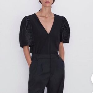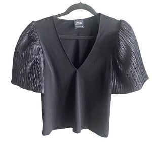 Zara Black V-Neck Short Dramatic Puff Sleeve Blouse. Size Small.