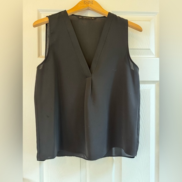 Chic black blouse with a deep V-neck. Sleeveless design for versatile styling. Ideal for both casual and formal wear.
