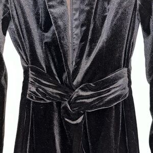 Sophisticated black velvet blazer dress with luxurious texture and tailored structure. This stunning piece features a dramatic plunging neckline with front twist detail and a flattering belted waist.
