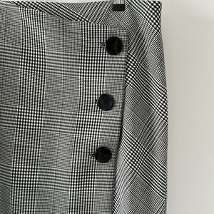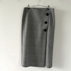 So flattering black & white wrap around skirt with three button closures. A lined, looks brand new. No tag on the inside.