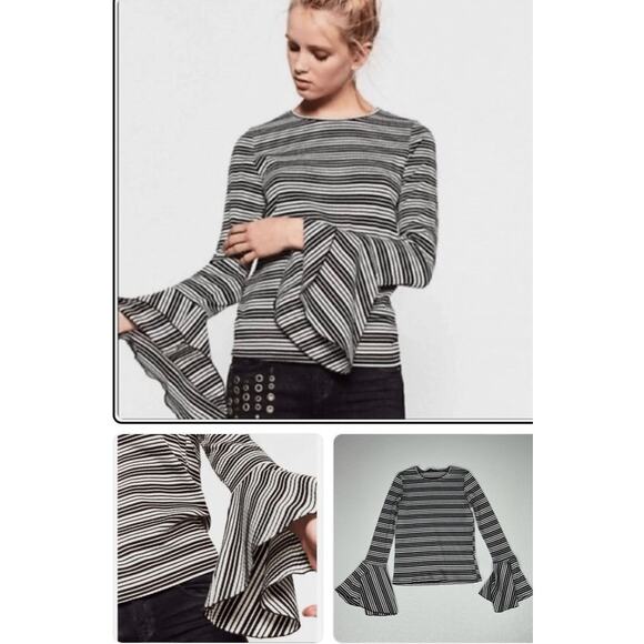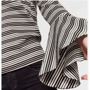 Zara Black & White Striped Bell Sleeve Top Flared Cuff Statement Blouse sz: S