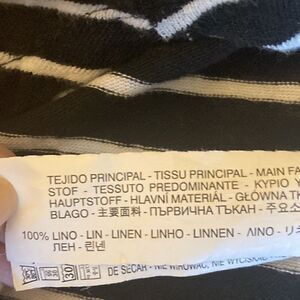 Zara black & white long sleeve linen top with long sleeves, Crewneck and rounded bottom. Center of long sleeve has wide band of black lace.